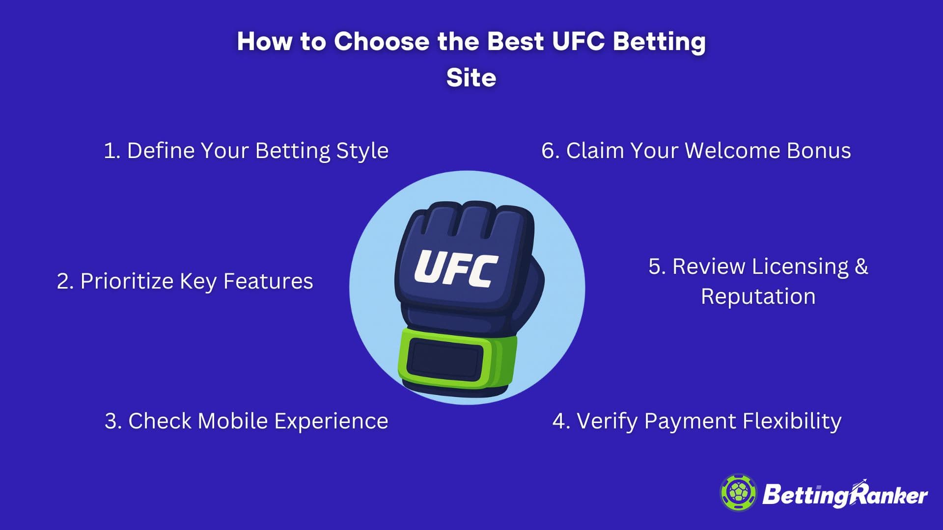 No existe un único sitio de apuestas de UFC que se adapte a todos. La mejor casa de apuestas para ti dependerá de cómo apuestas, qué características valoras y qué tan profundo quieres adentrarte en los mercados de UFC. Aquí tienes una guía rápida de 6 pasos para ayudarte a encontrar la plataforma adecuada para tu estilo de apuestas, utilizando solo casas de apuestas confiables presentadas en BettingRanker.